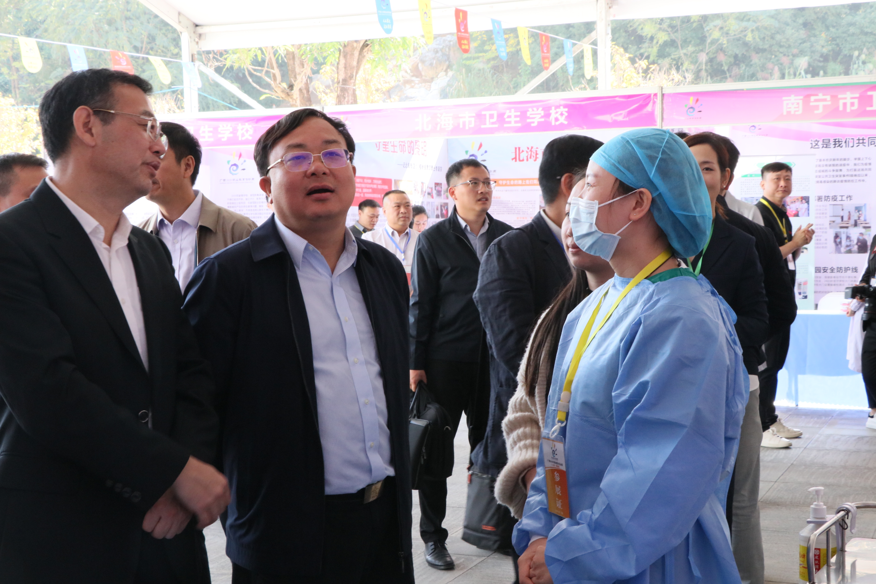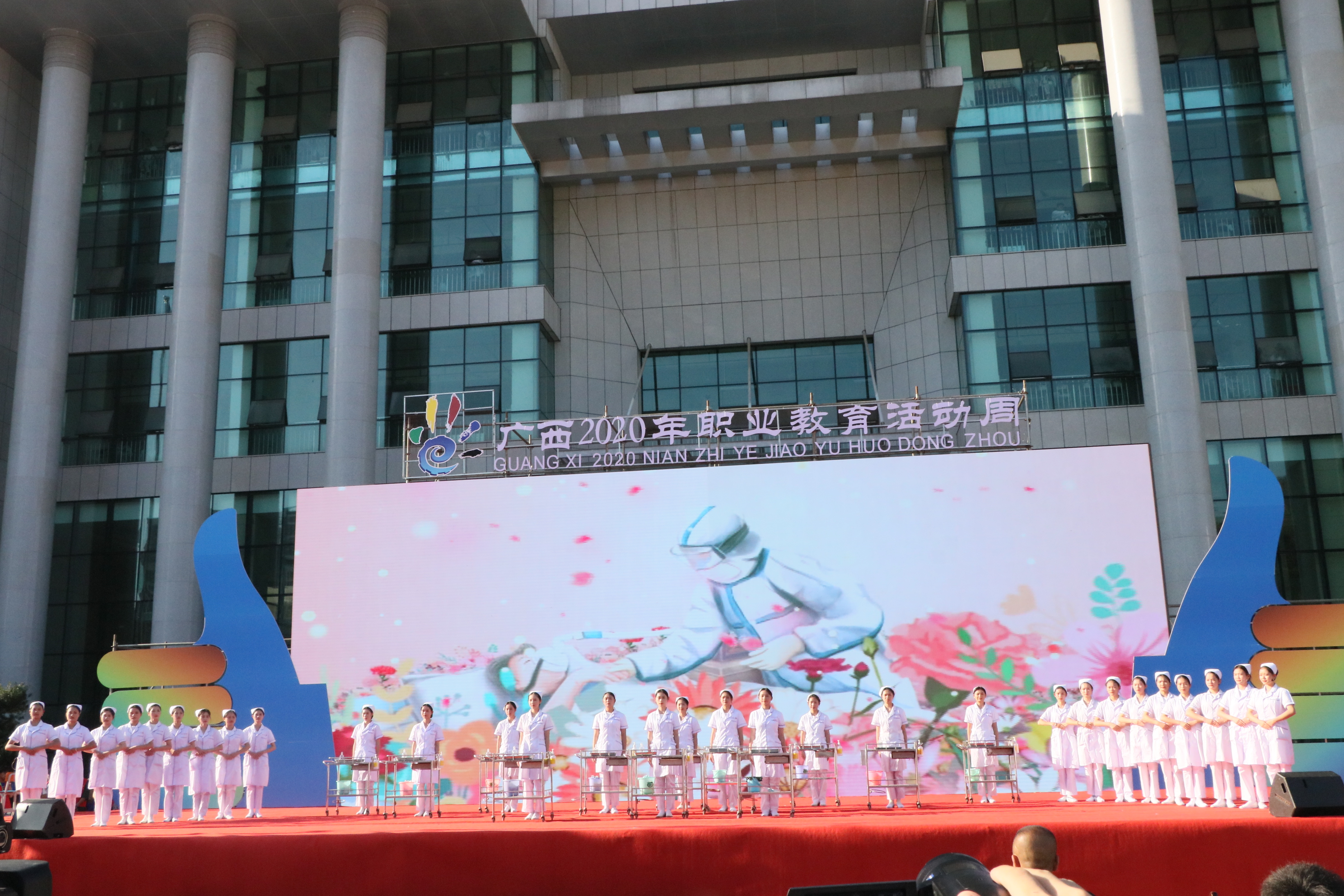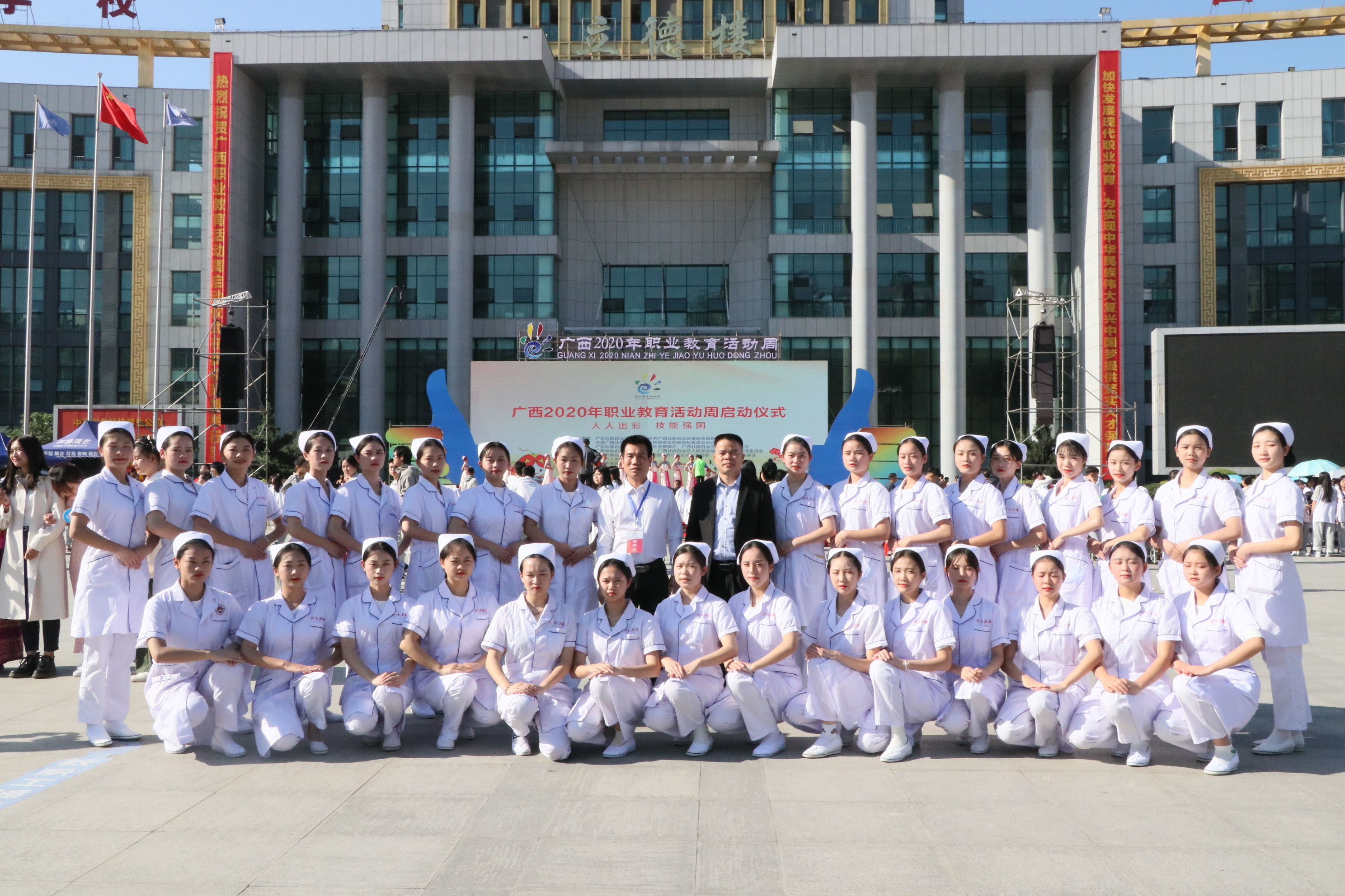 11月12日,主题为“人人出彩,技能强国”的广西2020年职业教育活动周启动仪式在河池市职业教育中心学校举行。学校党总支书记、校长陈朝亮率护士礼仪表演队和今年我校参加广西医疗队驰援武汉抗疫的优秀毕业生代表刘如春参加活动周启动仪式展示活动。