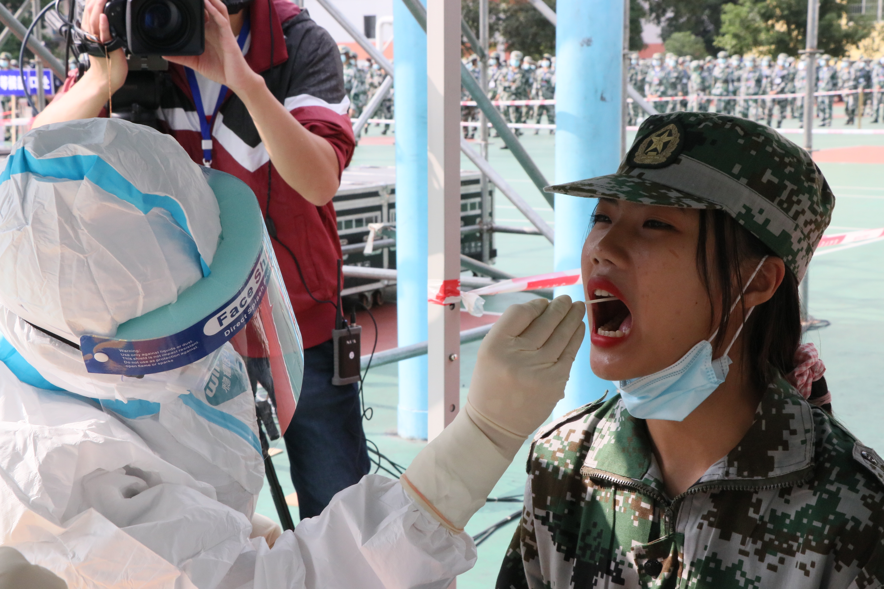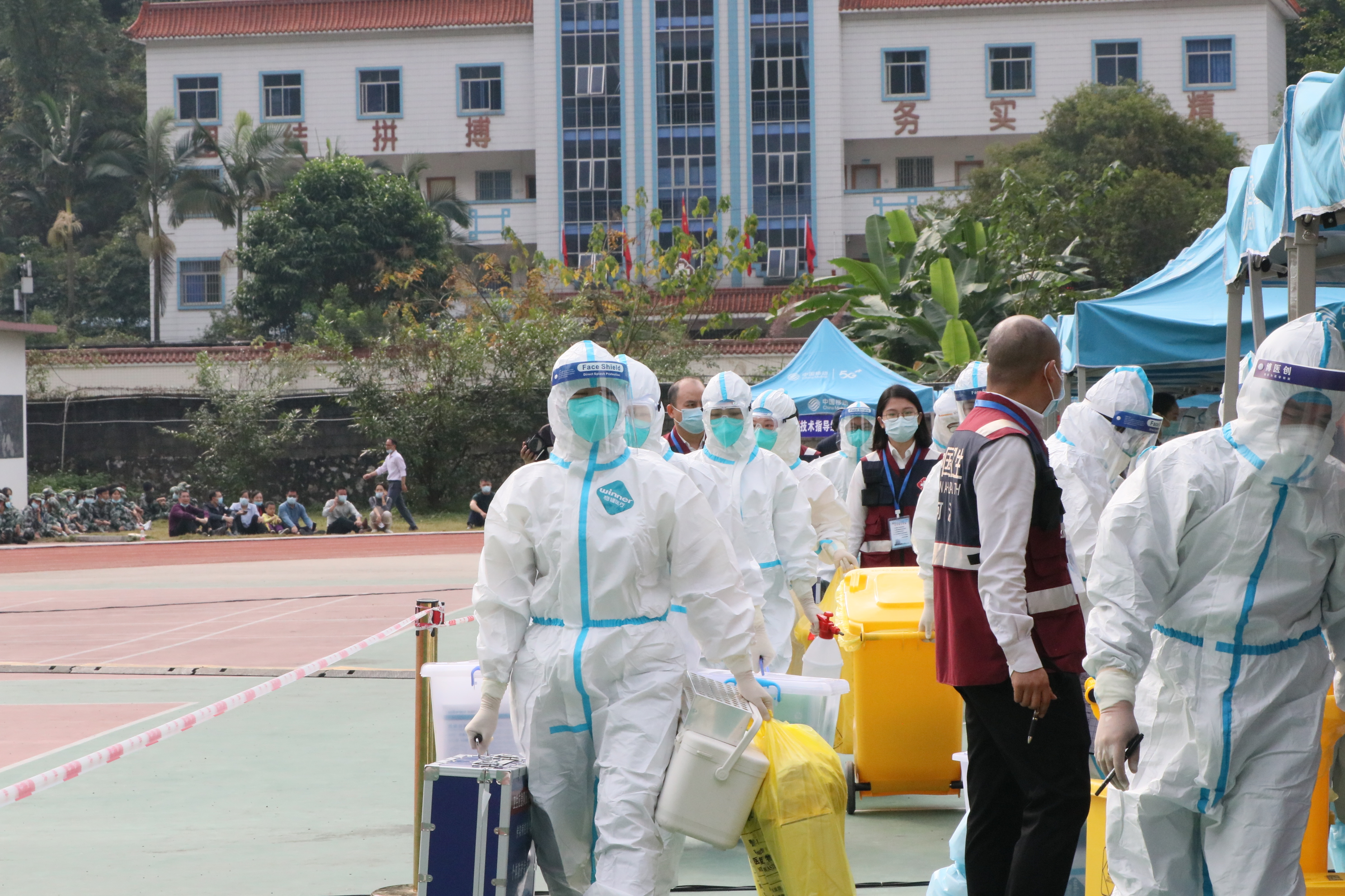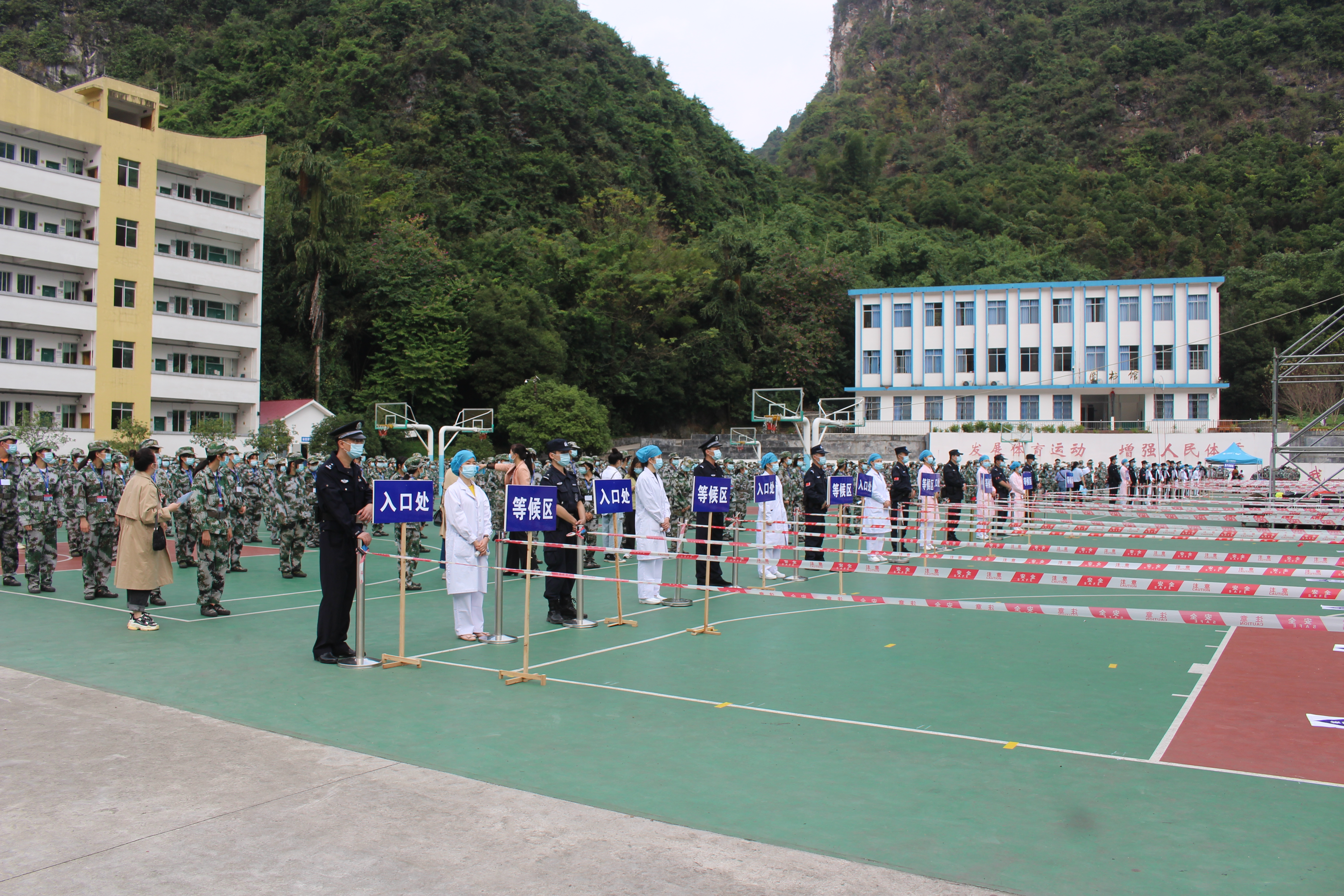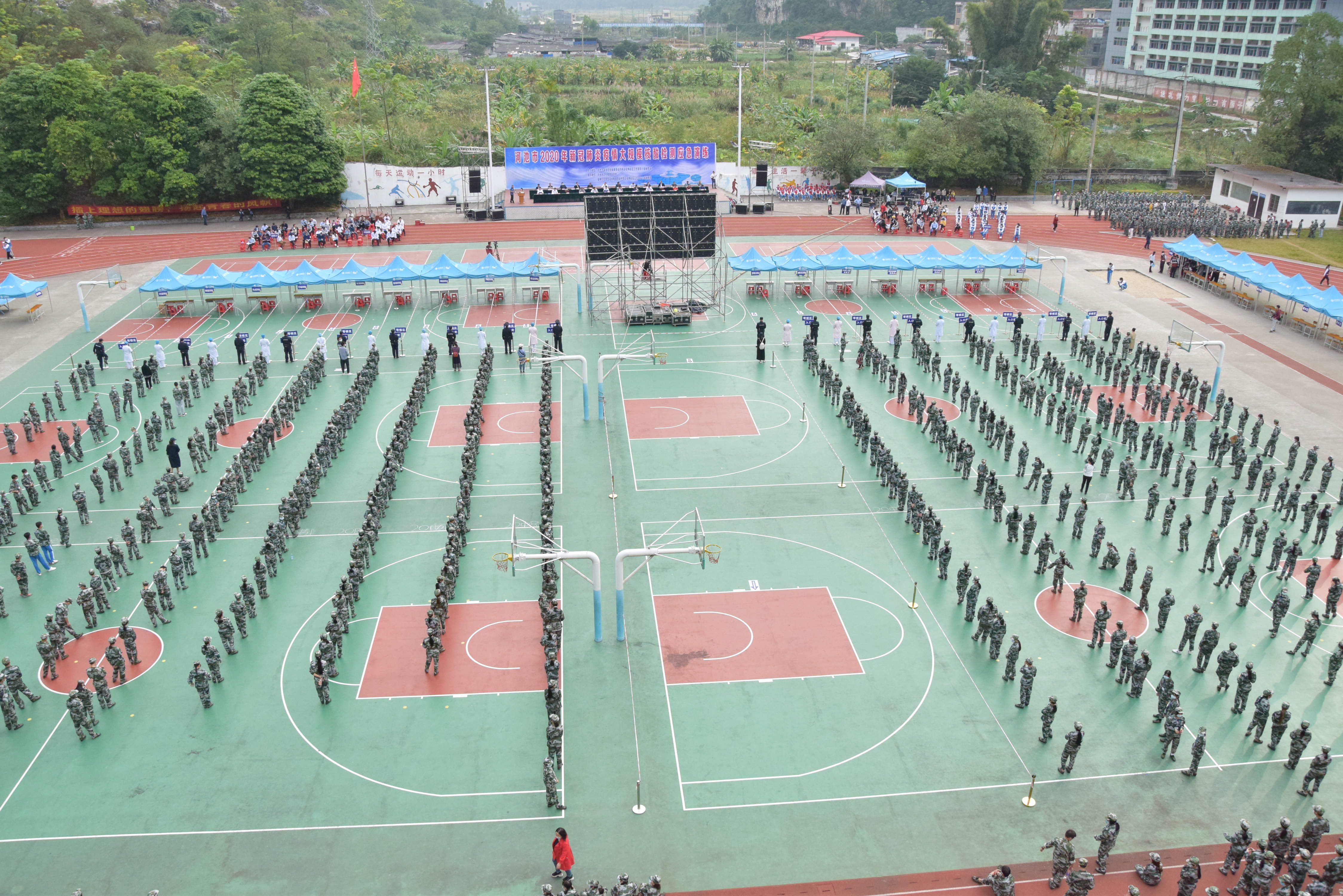 为认真总结河池市疫情防控工作经验,提高全市新冠肺炎疫情应急处置能力,全力维护人民群众身体健康和生命安全,11月21日上午, 2020年河池市新冠肺炎疫情大规模核酸检测应急演练在我校举行。市委宣传部、市疫情防控指挥部办公室、联防联控组、市卫生健康委、公安局、广播电视台,金城江疫情防控指挥部各相关人员、市疾控中心核酸采样检查技术指导组、各县(区)市直医疗单位以及我校部分师生参加演练。