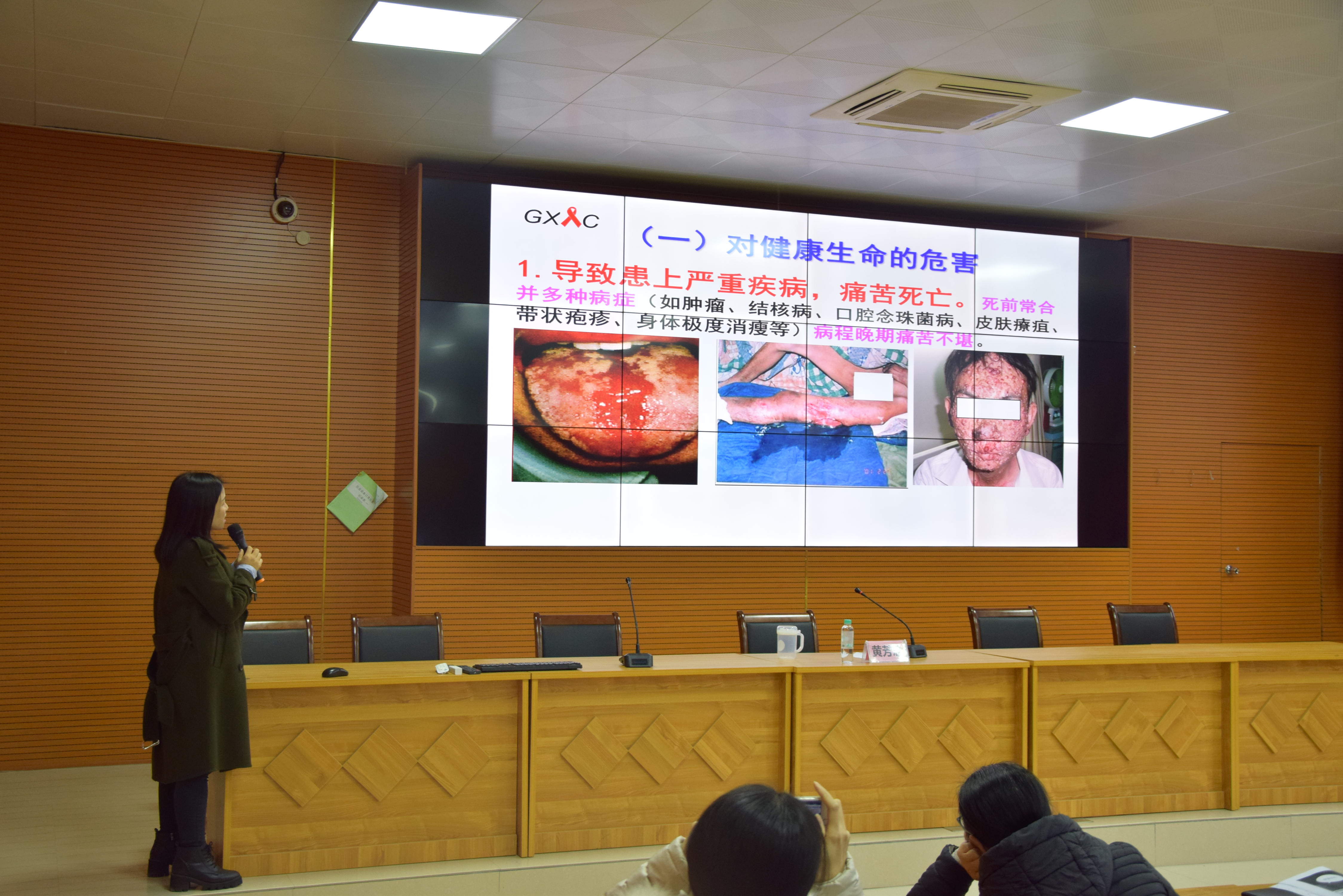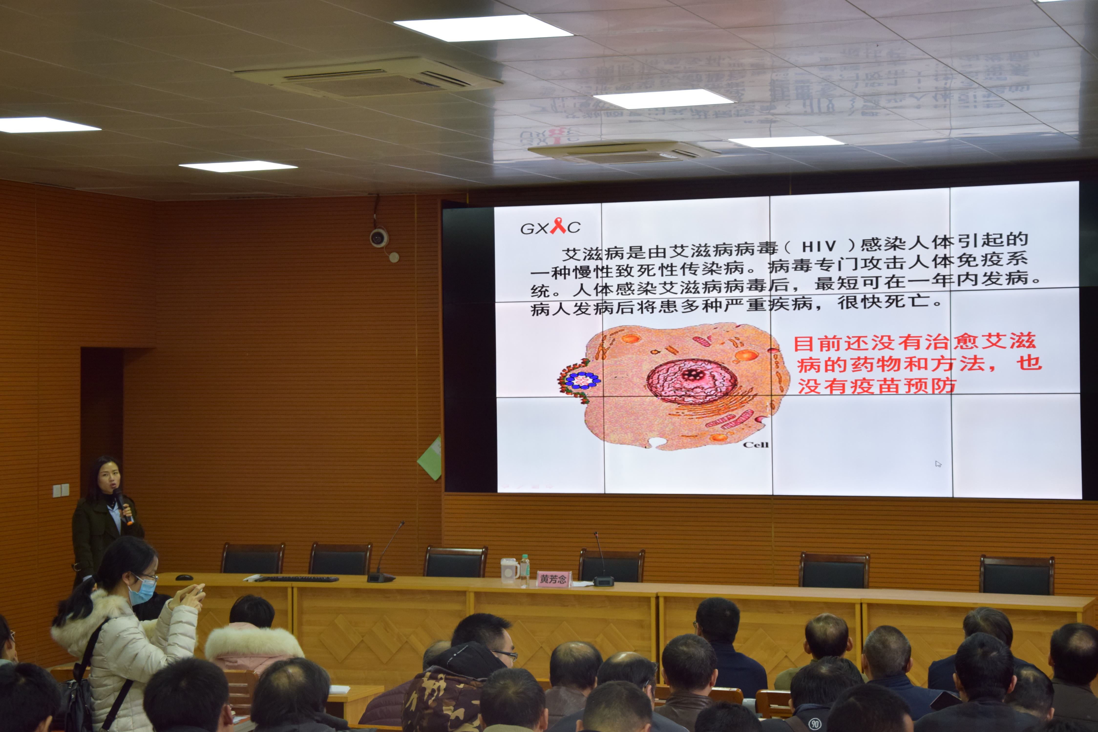 11月27日,学校邀请河池市疾控中心健康教育科科长黄芳念到我校开展防治艾滋病知识讲座,学校全体教职工参加讲座。