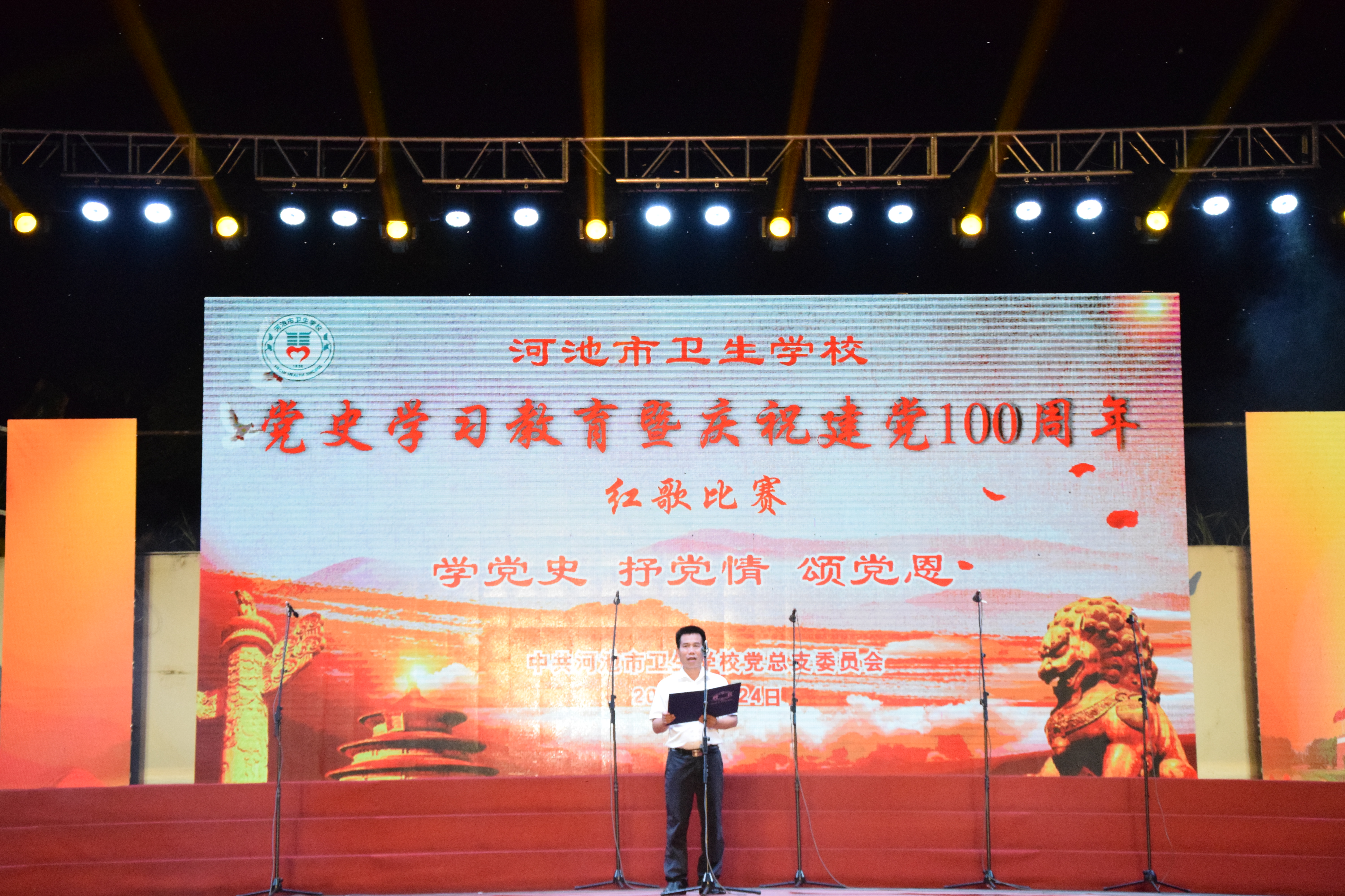 为庆祝中国共产党建党100周年,厚植青少年的家国情怀,我校积极开展党史学习教育系列活动,于6月24日晚上在学校田径场举行“学党史 抒党情 颂党恩 ——党史学习教育暨庆祝建党100周年红歌比赛”,学校校长陈朝亮、副校长周轩、刘钢出席活动。