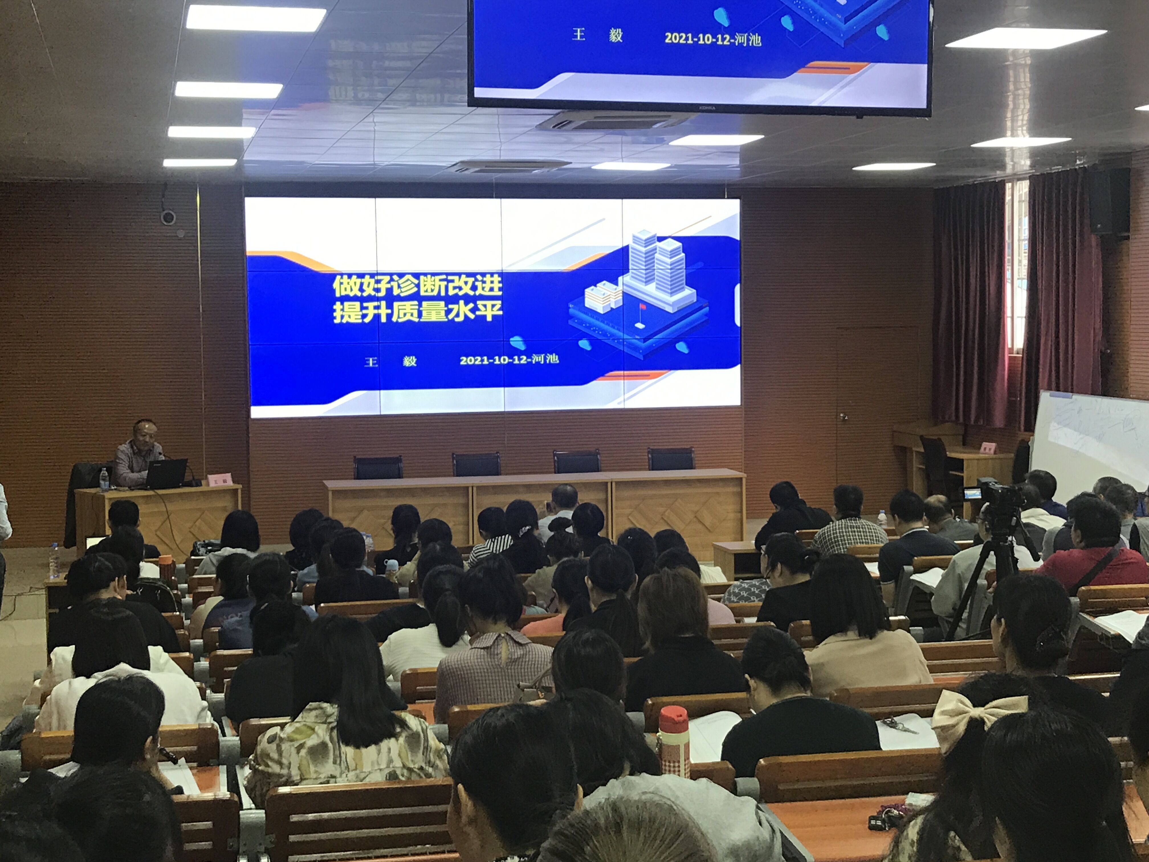 讲座上,王毅教授以《做好诊断改进,提升质量水平》为题,结合详实的数据、生动的案例,详细阐述了诊改与评估的区别、诊改问题分析、教学诊改目标、诊改起步六项内容、诊改信息平台建设要求等多项诊改知识。王毅强调,教学诊断与改进工作是学校的一项重要工作,要根据自治区教育厅《中职学校教学诊改复核工作指引》的要求,对标对表,针对学校自身短板,完善保证体系,建立8字质量螺旋,营造现代质量文化;加强智慧校园和数据中心建设,打造覆盖学校、专业、课程、教师、学生五个层面的质量管理信息化平台,实现数据管理、数据决策;在教学诊改中实现学校的“五个转变”和“六化目标”,提升学校办学水平和人才培养质量。