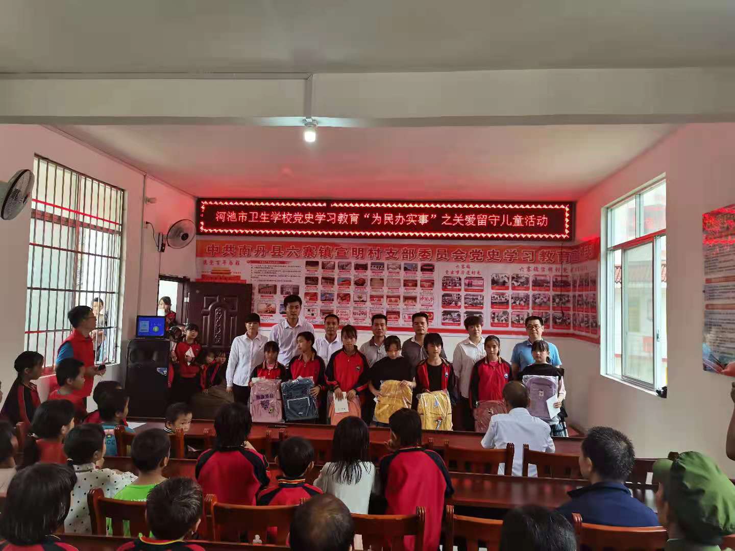 党课结束后,学校领导和宣明村委一起给宣明村宣明小学的留守儿童学生送去了书包和文具,希望同学们在今后的学习中要好好学习,将来做祖国有用的人,为国家、社会和家乡贡献自己的力量。最后,大家观看了宣村委组织的颂党歌咏比赛,饱含深情的演唱,表达了对党的无限忠诚和 永远跟党走的决心,现场不时响起雷鸣般的掌声!