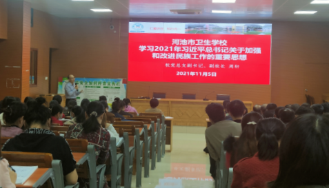 2011年11月5日,我校全体教职工集中学习了习近平总书记关于加强和改进民族工作的重要思想。会议包含两个议程:1.学习习近平总书记在2021年中央民族工作会议上的讲话精神;2.学习习近平总书记视察广西时有关民族工作的重要讲话和重要指示精神。