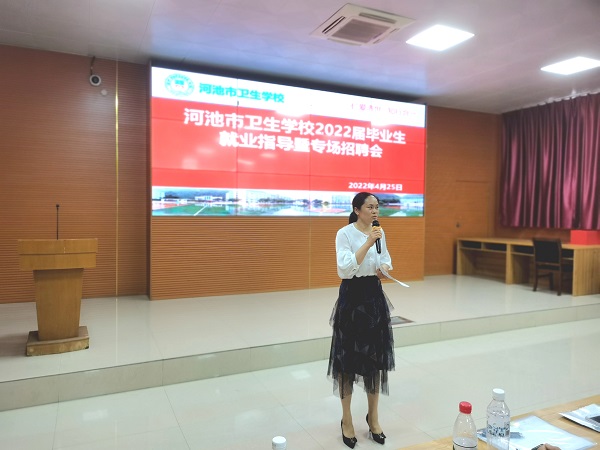 4月26日,河池市卫校在第四多媒体教室举行2022届高职护理专业毕业生就业指导暨专场招聘会。学校招就办主任黄鸿宇主持会议,高职办主任兰洪给毕业生们做就业动员及指导,2022届高职护理毕业班班主任也到场具体指导本班学生。
